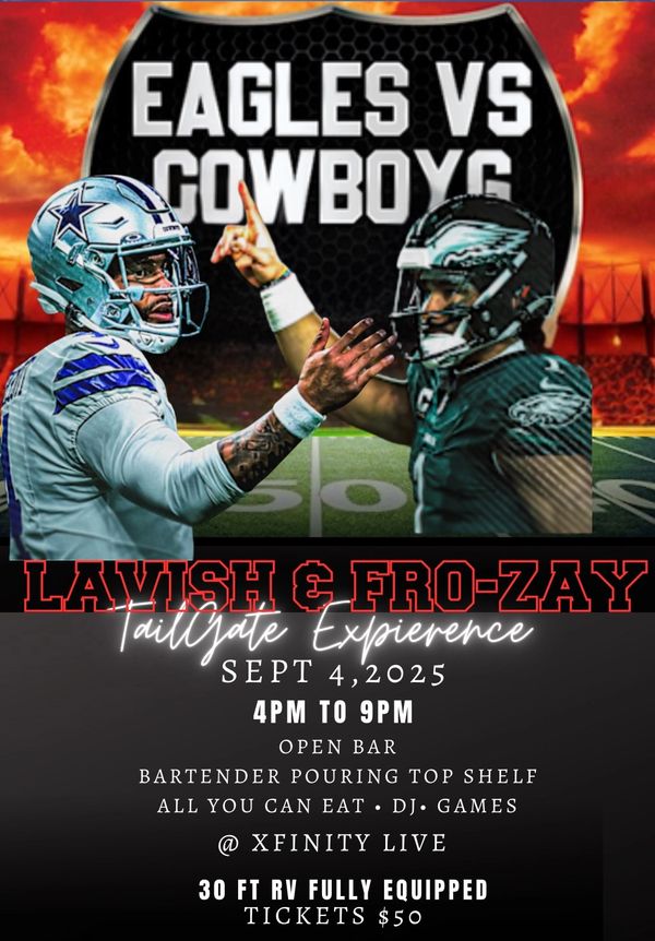 Join us for our exclusive tailgate event. September 4, 2025 at Xfinity Live. Tickets are $50. Enjoy Open bar top shelf and Frozay products.